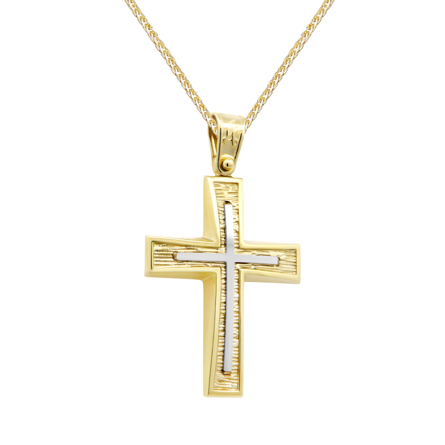 Ανάγλυφος δίχρωμος ανδρικός σταυρός από χρυσό 14 καρατίων.