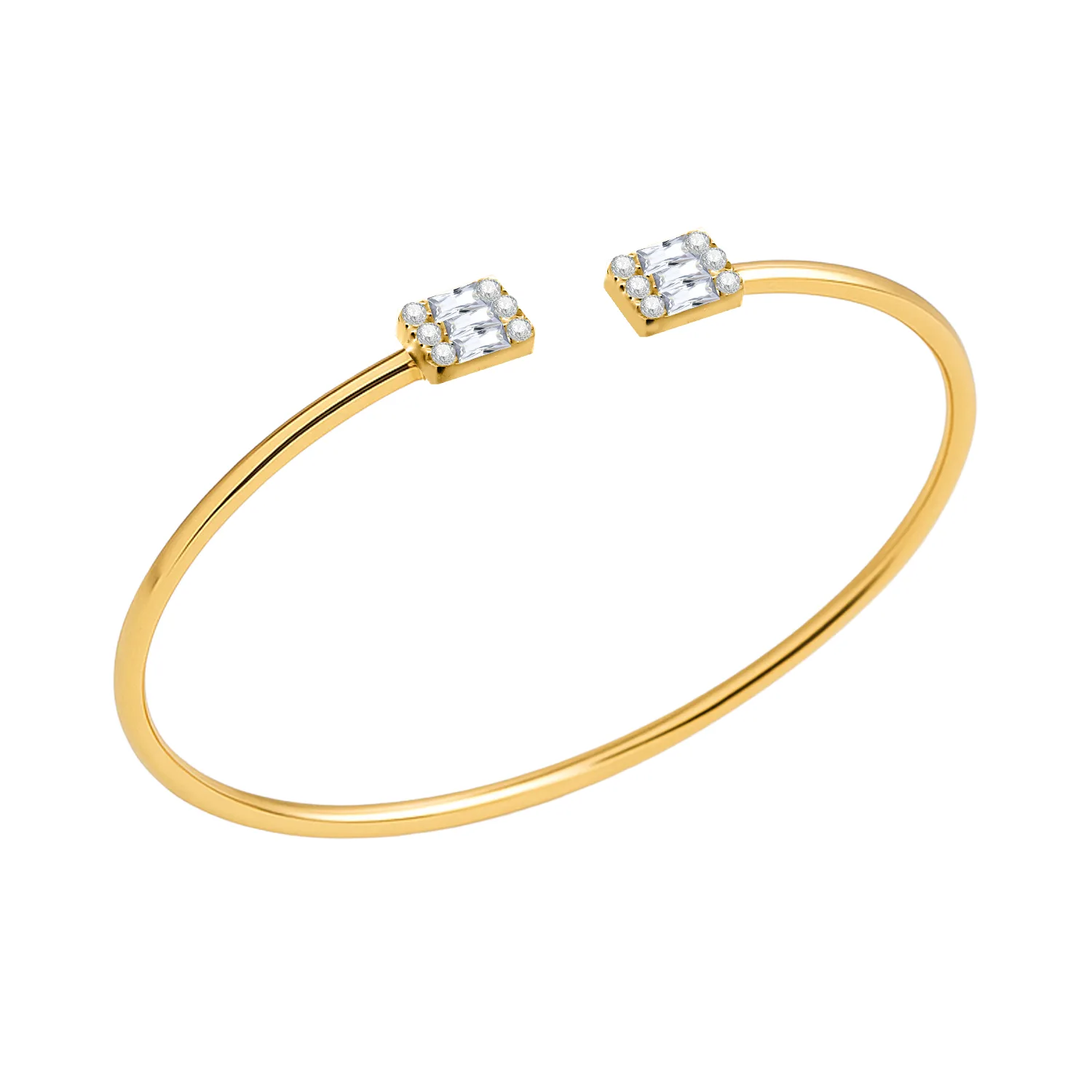 Εκλεπτυσμένη και μοντέρνα, αυτή η ανοιχτή χειροπέδα συνδυάζει την απλότητα με τη λάμψη. Διαθέτει τετράγωνα άκρα διακοσμημένα με λαμπερές λευκές πέτρες κοπής baguette και round, προσφέροντας διακριτική πολυτέλεια σε κάθε εμφάνιση. Η λεπτή γραμμή και ο μινιμαλιστικός σχεδιασμός την καθιστούν ιδανική για layering ή για να φορεθεί μόνη της ως κομψή πινελιά.