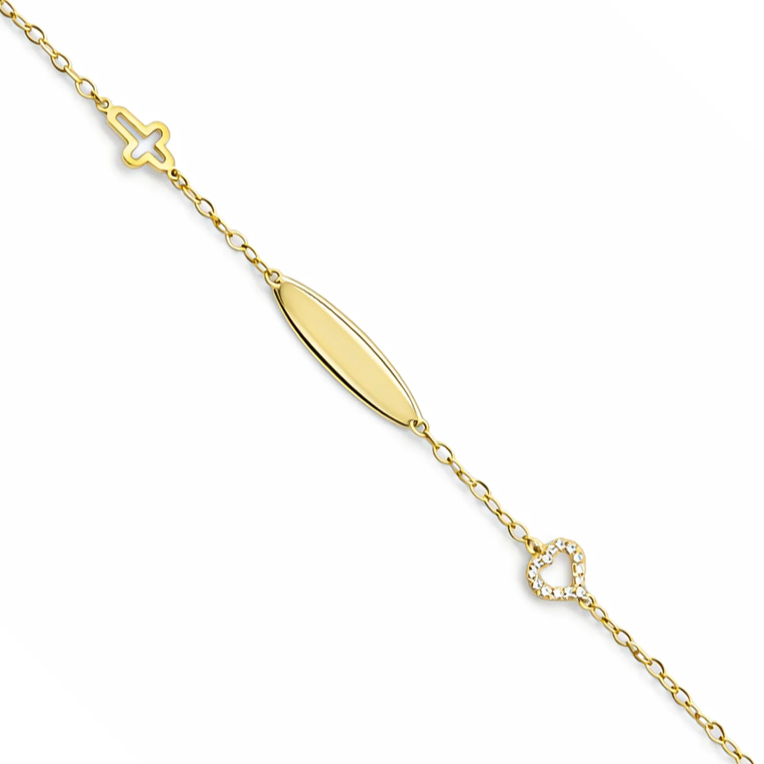 Ένα ιδιαίτερα λαμπερό και κομψό παιδικό βραχιόλι-ταυτότητα, κατασκευασμένο από χρυσό 9 καρατίων. Το κόσμημα αυτό συνδυάζει την πολυτέλεια των λίθων με ιερά σύμβολα, αποτελώντας ένα υπέροχο δώρο για κορίτσια που θα μείνει αναλλοίωτο στον χρόνο.