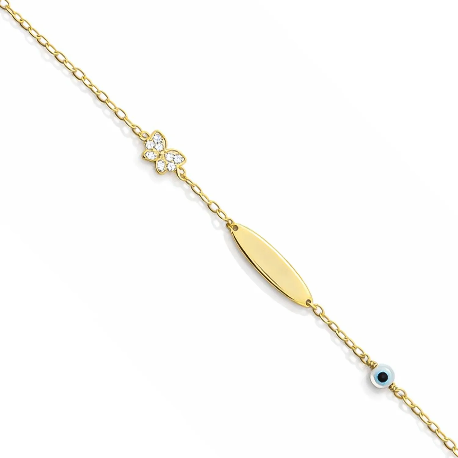 Ένα υπέρκομψο και λαμπερό παιδικό βραχιόλι-ταυτότητα, κατασκευασμένο από χρυσό 9 καρατίων. Το κόσμημα αυτό συνδυάζει την πολυτέλεια των πολύτιμων λίθων με παραδοσιακά σύμβολα, αποτελώντας ένα μοναδικό δώρο για κορίτσια.