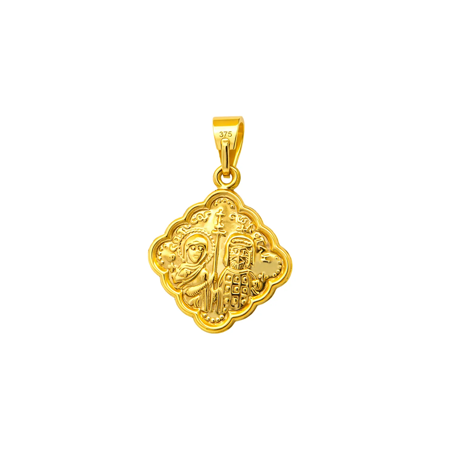 Ένα ιδιαίτερο θρησκευτικό φυλαχτό με περίτεχνο τετράφυλλο σχήμα, κατασκευασμένο από χρυσό 9 καρατίων. Το κόσμημα διακρίνεται για τον δίπλευρο σχεδιασμό του και τις καμπυλωτές λεπτομέρειες στην περίμετρο, που του χαρίζουν μια ρομαντική και κλασική αισθητική.