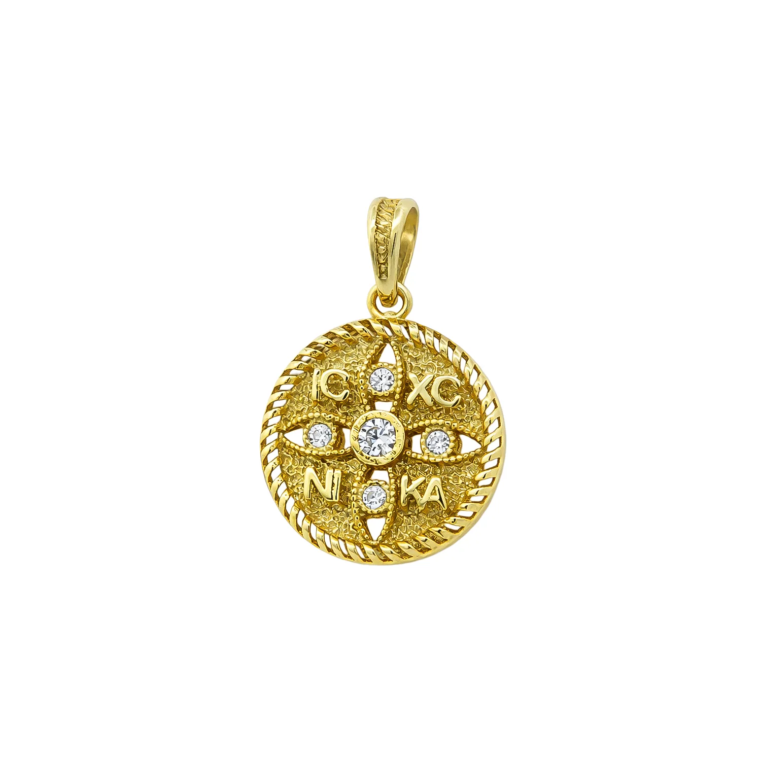 Ένα ιδιαίτερα καλλιτεχνικό και λαμπερό θρησκευτικό μενταγιόν σε στρογγυλό σχήμα, κατασκευασμένο από χρυσό 9 καρατίων (375). Το κόσμημα ξεχωρίζει για τον περίτεχνο διάτρητο σχεδιασμό του και τη δίπλευρη διακόσμηση με πολύτιμες λεπτομέρειες.