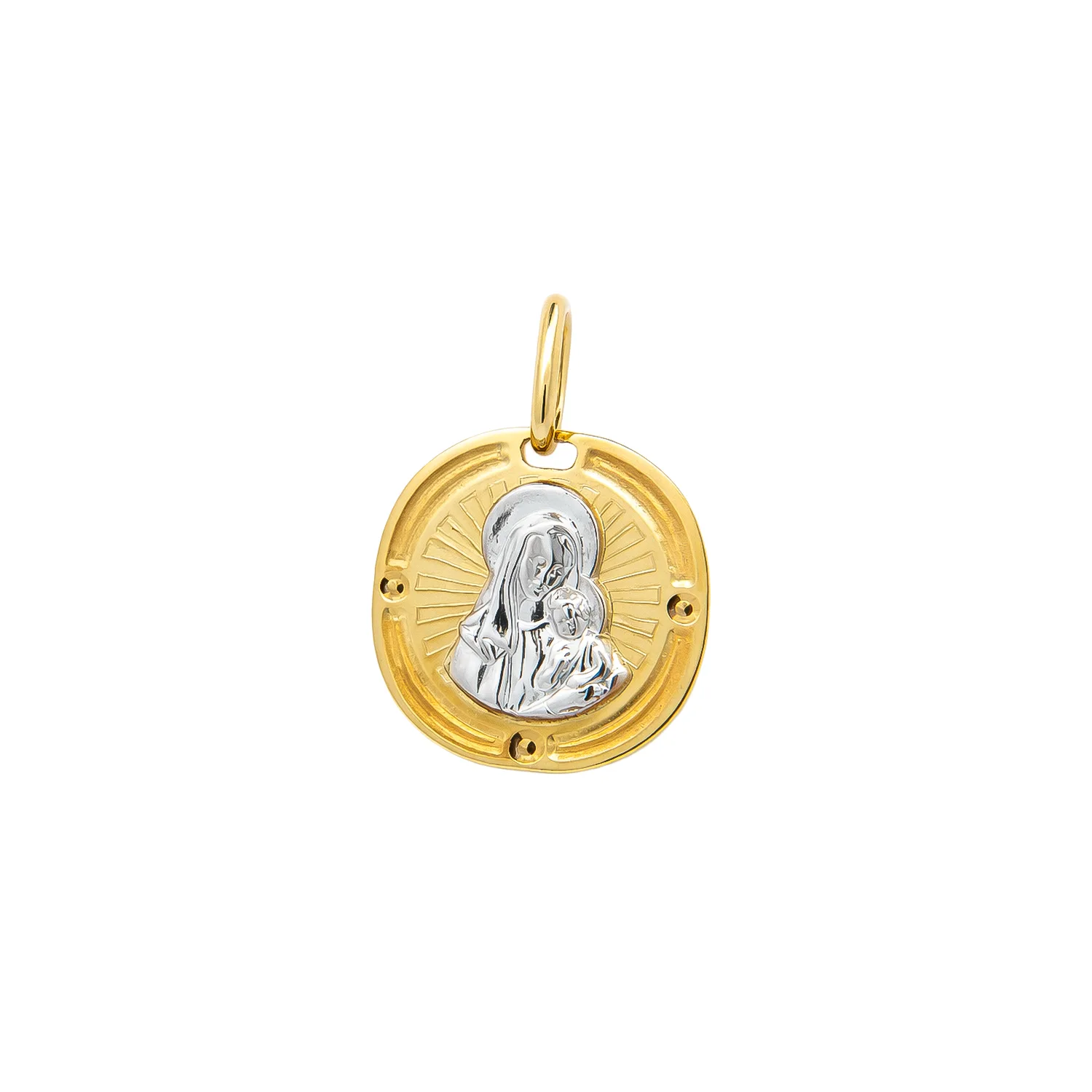 Ένα υπέροχο θρησκευτικό μενταγιόν σε στρογγυλό σχήμα, κατασκευασμένο από χρυσό 9 καρατίων (375). Στο κέντρο του δεσπόζει η μορφή της Παναγίας με το Θείο Βρέφος σε ανάγλυφη λευκόχρυση επεξεργασία, η οποία προσδίδει βάθος και ιδιαίτερη λάμψη στην ιερή παράσταση.