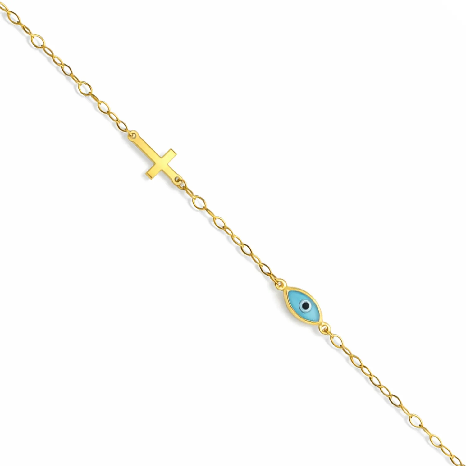 Ένα φινετσάτο και γεμάτο συμβολισμούς γυναικείο βραχιόλι, κατασκευασμένο από χρυσό 9 καρατίων (375). Ο σχεδιασμός του παντρεύει την παράδοση με έναν σύγχρονο, minimal χαρακτήρα, δημιουργώντας ένα κόσμημα που προσφέρει προστασία και κομψότητα σε κάθε εμφάνιση.