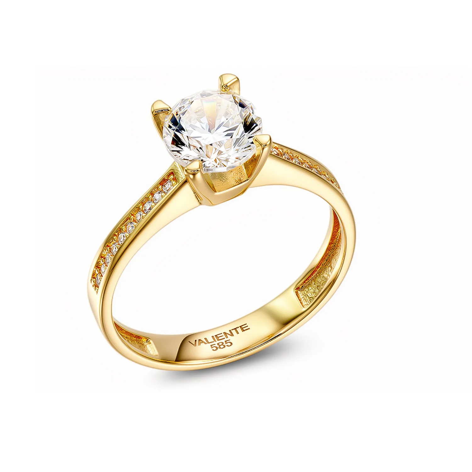 Ένα κόσμημα που αποπνέει πολυτέλεια και σιγουριά. Αυτό το χρυσό μονόπετρο 14 καρατίων φέρει την υπογραφή “Valiente” και τη σφραγίδα 585 στο εσωτερικό του, εγγύηση της ποιότητας κατασκευής του. Η εντυπωσιακή κεντρική πέτρα αναδεικνύεται από το κομψό δέσιμο, ενώ οι σειρέ πέτρες στους ώμους του δαχτυλιδιού προσθέτουν επιπλέον λάμψη.