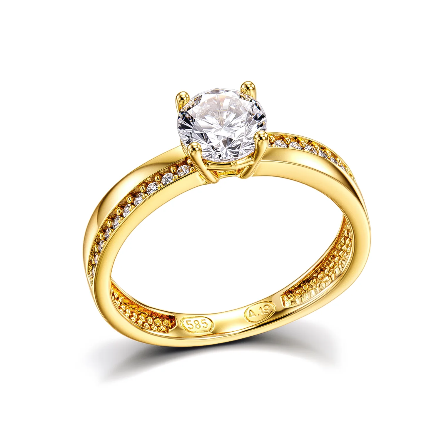 Ένα εντυπωσιακό χρυσό μονόπετρο που συνδυάζει την κλασική κομψότητα με τη μοντέρνα λάμψη. Κατασκευασμένο από χρυσό 14 καρατίων (με σφραγίδα 585), διαθέτει μια λαμπερή κεντρική πέτρα που συγκρατείται από τέσσερα δοντάκια. Η γάμπα του δαχτυλιδιού είναι διακοσμημένη με μικρότερες πέτρες, προσφέροντας επιπλέον φως. Το εσωτερικό του είναι σχεδιασμένο με ειδικό πλέγμα για να είναι ελαφρύ και άνετο στο δάχτυλο.