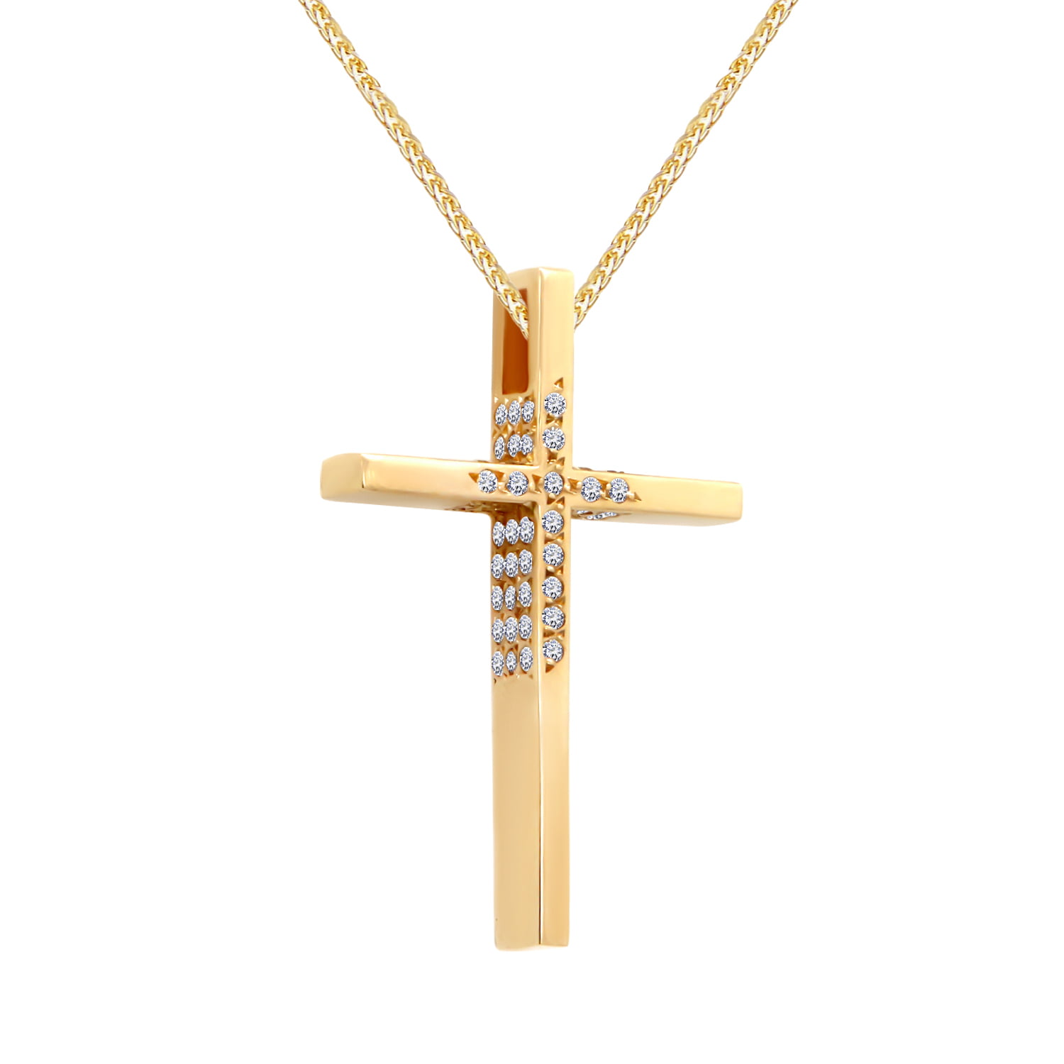 Χρυσός γυναικείος σταυρός από χρυσό 14 καρατίων. Είναι διακοσμημένος με 3 σειρές ζιργκόν στα πλαϊνά και μια κεντρική.