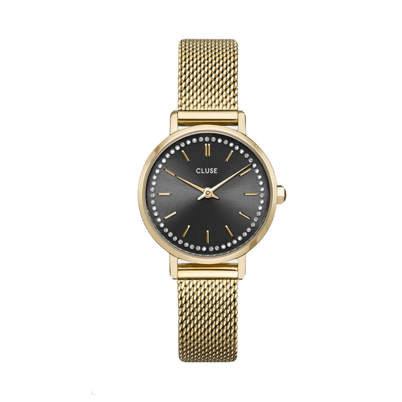 Γυναικείο ρολόι Cluse της σειράς Boho Chic Petite κατασκευασμένο από επιχρυσωμένο ανοξείδωτο ατσάλι με ανθρακί καντράν και πέτρες ζιργκόν στο εσωτερικό