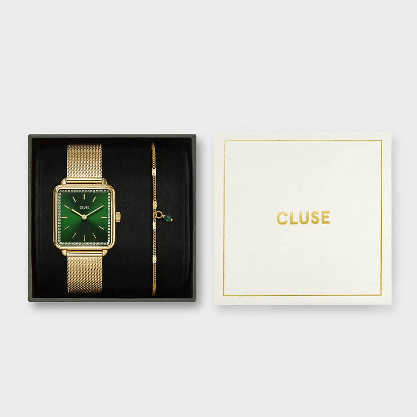 Γυναικείο ρολόι Cluse της σειράς La Tetragone κατασκευασμένο από επίχρυσο ανοξείδωτο ατσάλι με εντυπωσιακό πράσινο καντράν στο εσωτερικό. Το ρολόι συνοδεύεται με ατσάλινο βραχιόλι δώρο της εταιρίας Cluse