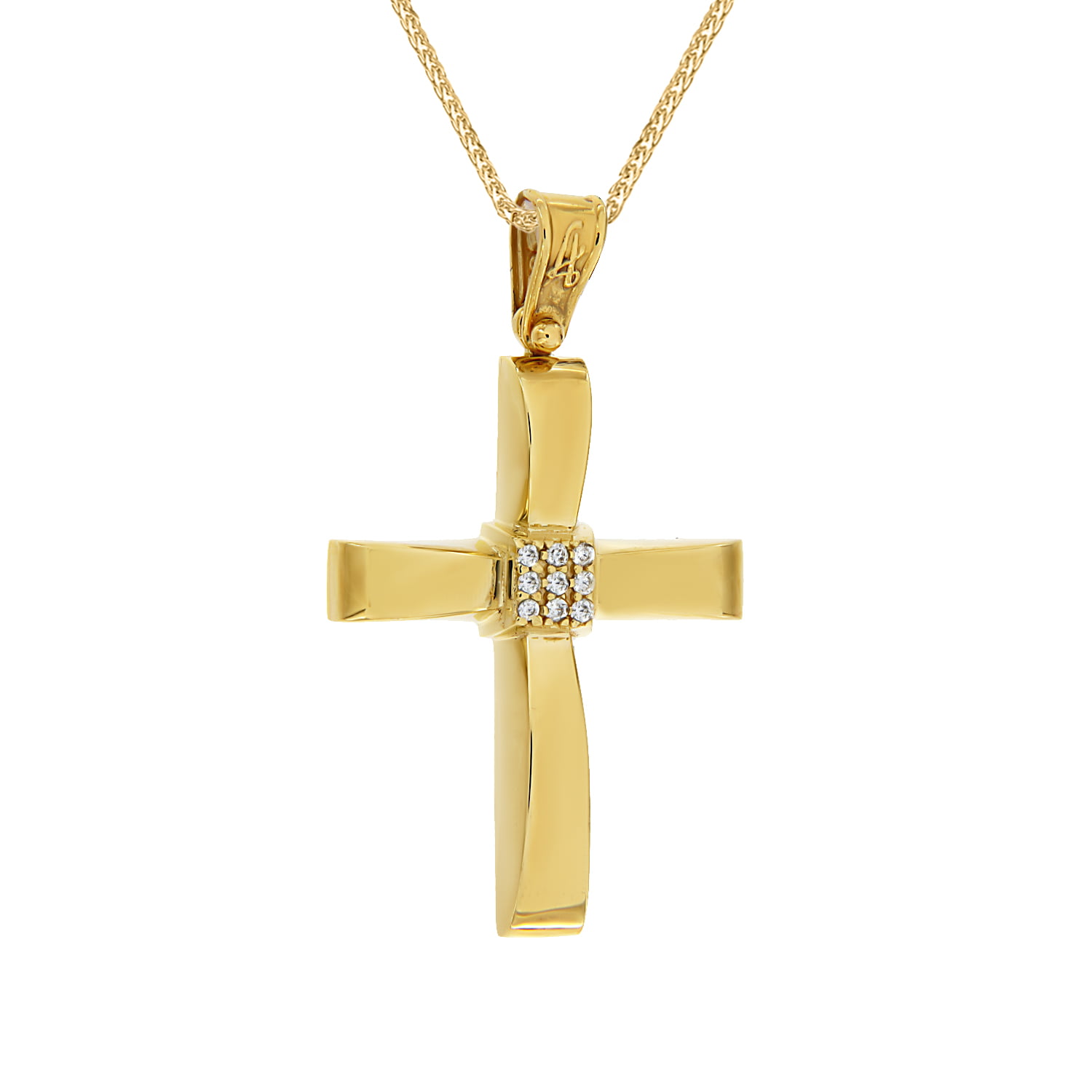 Ένας γυναικείος σταυρός από χρυσό 14 καρατίων και κεντρικές πέτρες ζιργκόν. Ο σταυρός είναι κατάλληλος για κάθε περίσταση και κάθε ηλικία.