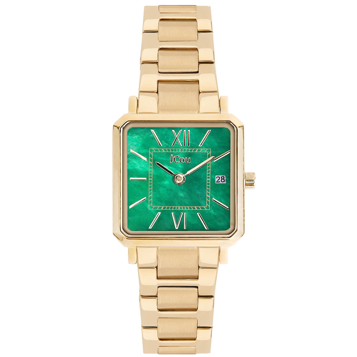 Ρολόι JCou της σειράς Azure κατασκευασμένο από χρυσό ανοξείδωτο ατσάλι. Διαθέτει εντυπωσιακό πράσινο καντράν από φίλντισι με ένδειξη ημερομηνίας στο εσωτερικό. Ένα όμορφο κομψό ρολόι που θα αναδείξει το καθημερνό σας στιλ.