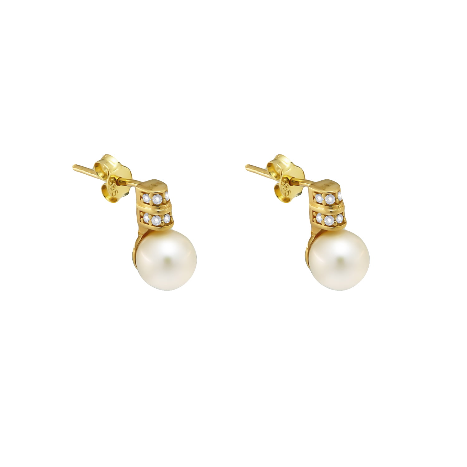 Γυναικεία κρεμαστά σκουλαρίκια από χρυσό 14 καρατίων με μαργαριτάρια και λευκές διακοσμητικές πέτρες ζιργκόν.