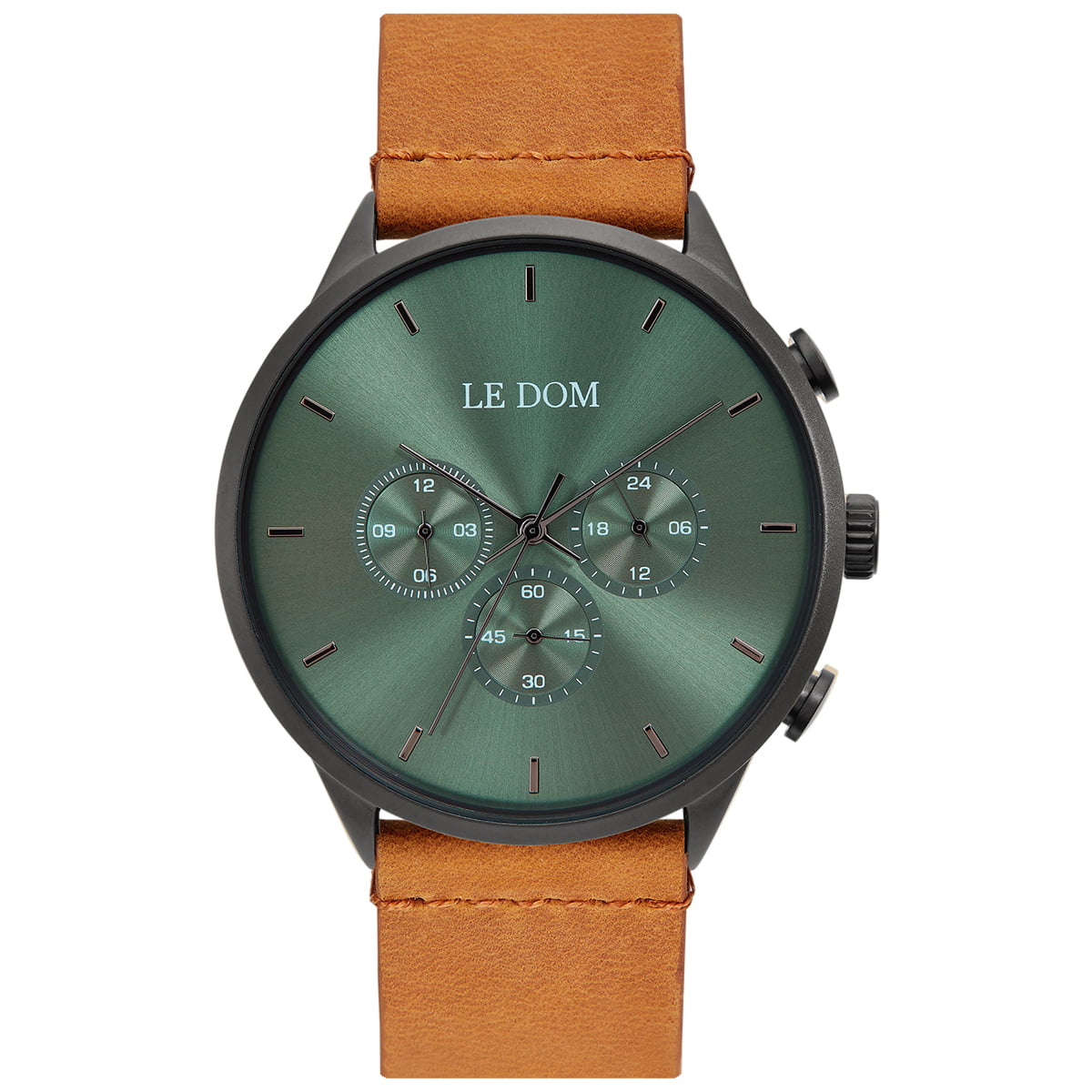 Ρολόι LEDOM της σειράς Principal με χρονογράφο στο πράσινο καντράν, κάσα από μαύρο ορείχαλκο και καφέ δερμάτινο λουρί.