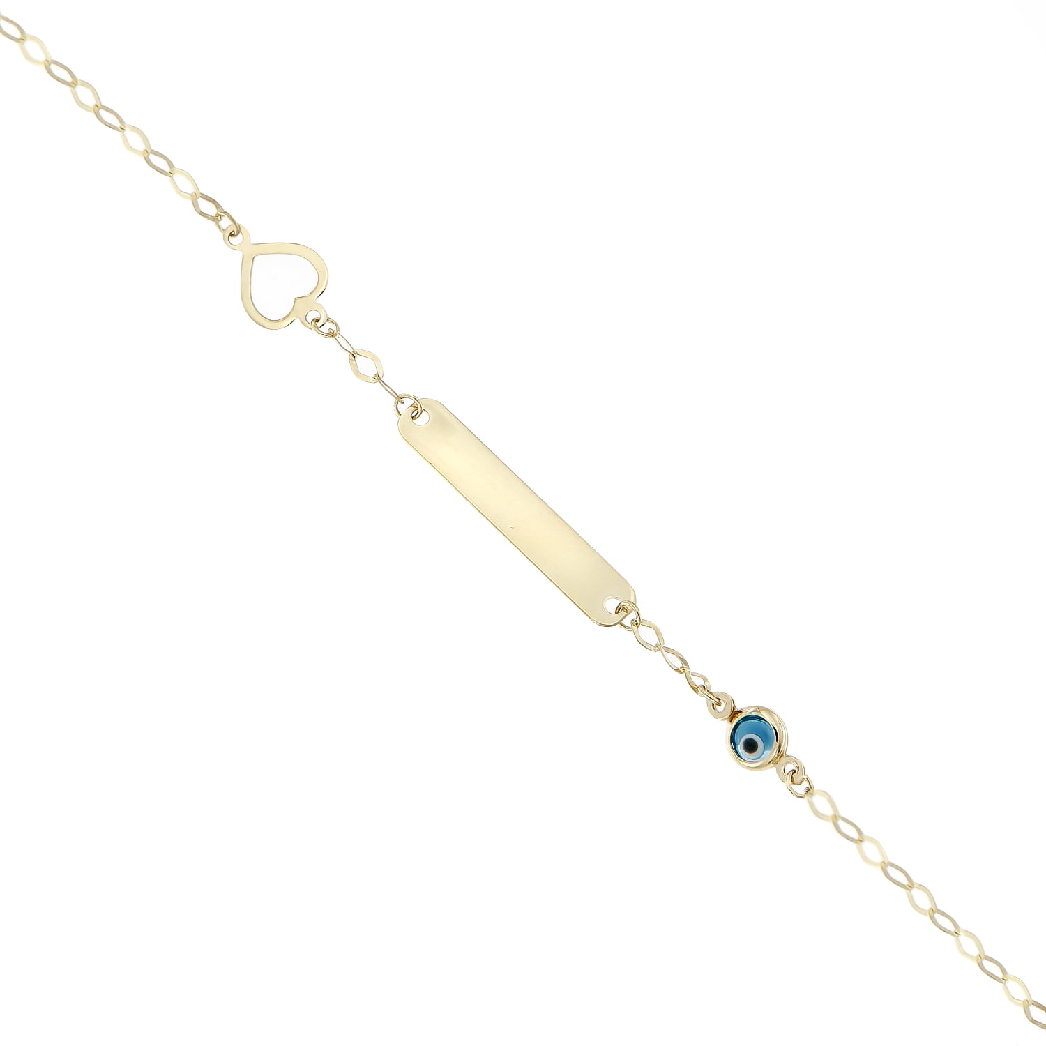 Παιδική ταυτότητα με λουστρέ επιφάνεια από χρυσό 14 καρατίων διακοσμημένη με μπλε ματάκι και καρδιά στο πλάι