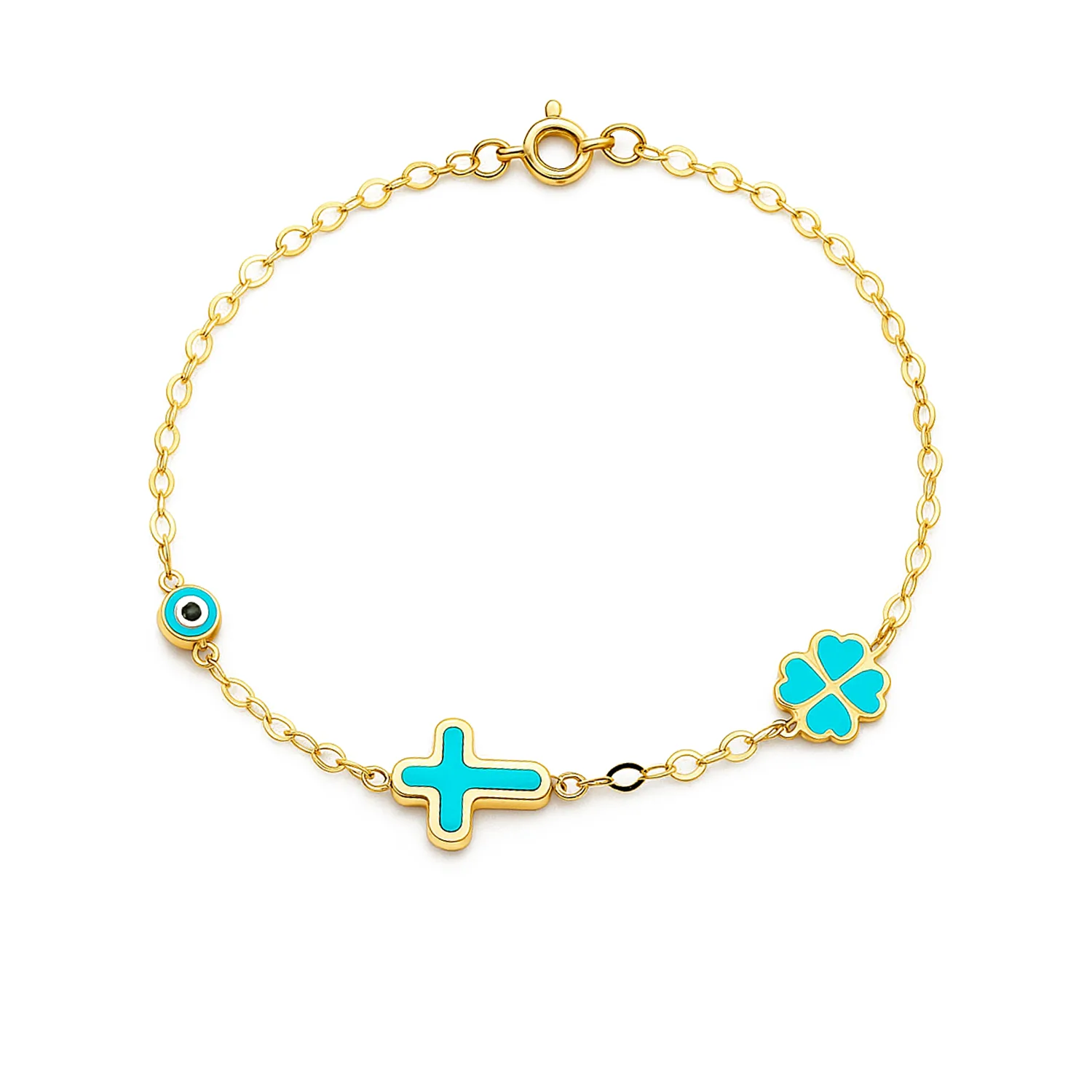 Ένα φωτεινό και συμβολικό κόσμημα από χρυσό 9 καρατίων, διακοσμημένο με γαλάζιο ματάκι, σταυρό με γυαλιστερό σμάλτο και τετράφυλλο τριφύλλι στο ίδιο χρώμα. Ένα βραχιόλι που συνδυάζει την προστασία, την πίστη και την τύχη, με νεανική και μοντέρνα αισθητική. Ιδανικό για καθημερινή χρήση ή ως δώρο αγάπης και θετικής ενέργειας.