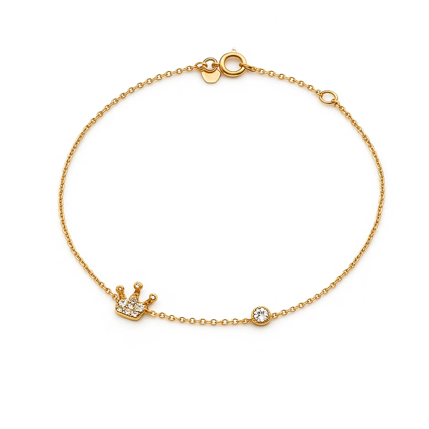 Κομψό και παιχνιδιάρικο, αυτό το βραχιόλι από χρυσό 14 καρατίων στολίζεται με ένα μοτίβο κορώνας, διακοσμημένο με λαμπερά λευκά ζιρκόνια, σύμβολο λάμψης και αυτοπεποίθησης. Συνοδεύεται από μία στρογγυλή πέτρα ζιρκονίου στο πλάι για μια έξτρα πινελιά φωτός και κομψότητας. Ένα λαμπερό και κοριτσίστικο κόσμημα, που αποπνέει στυλ και δυναμισμό.