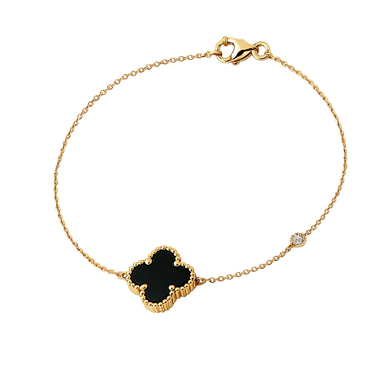 Μοντέρνο και ταυτόχρονα διαχρονικό, αυτό το βραχιόλι από χρυσό Κ9 αναδεικνύεται μέσα από το εντυπωσιακό τετράφυλλο μοτίφ με μαύρη λάκα ή ονυχα και διακριτική λεπτομέρεια από ζιργκόν. Η ανάγλυφη μπορντούρα προσδίδει βάθος και πολυτέλεια στο κόσμημα, ενώ η minimal αλυσίδα ολοκληρώνει το κομψό του προφίλ. Ένα κόσμημα με έντονο χαρακτήρα και ιδιαίτερο συμβολισμό, ιδανικό για να φορεθεί μόνο του ή σε layering με άλλα βραχιόλια.