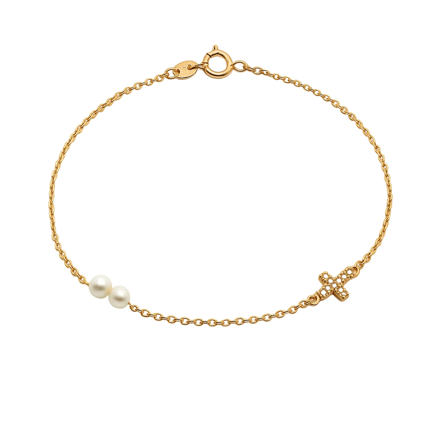 Ένα φίνο και διακριτικά εντυπωσιακό κόσμημα που συνδυάζει πίστη, φινέτσα και διαχρονική θηλυκότητα. Το βραχιόλι από χρυσό 14 καρατίων διαθέτει έναν σταυρό με λαμπερά ζιργκόν και δύο λευκά μαργαριτάρια, τοποθετημένα συμμετρικά στην αλυσίδα, δημιουργώντας μια ισορροπημένη και κομψή σύνθεση. Ιδανικό για όσους αγαπούν τα κοσμήματα με βαθύτερο νόημα ή αναζητούν ένα κομψό φυλαχτό για καθημερινή χρήση.