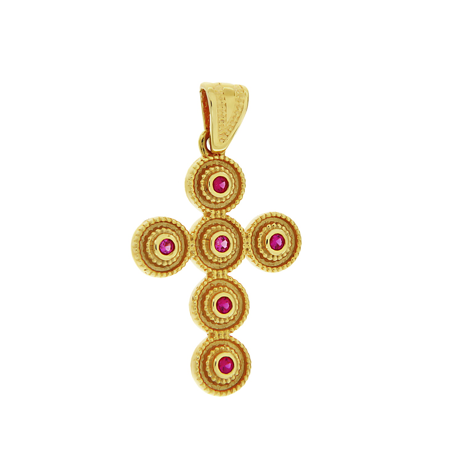 Ένας ιδιαίτερος βυζαντινός σταυρός από χρυσό 14 καρατίων με φουξ πέτρες ζιργκόν μέσα σε κύκλους.