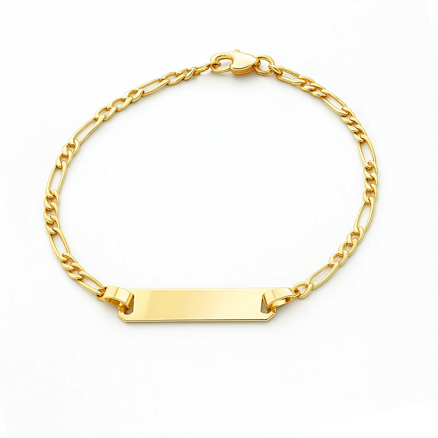 Διαχρονικό και κομψό, αυτό το βραχιόλι-ταυτότητα από χρυσό 9 καρατίων διαθέτει εντυπωσιακή καδένα τύπου Figaro και λεία επιφάνεια για χάραξη. Ιδανική επιλογή για δώρο με προσωπικό μήνυμα, ημερομηνία ή όνομα, προσδίδοντας μοναδικότητα και αξία στο κόσμημα.