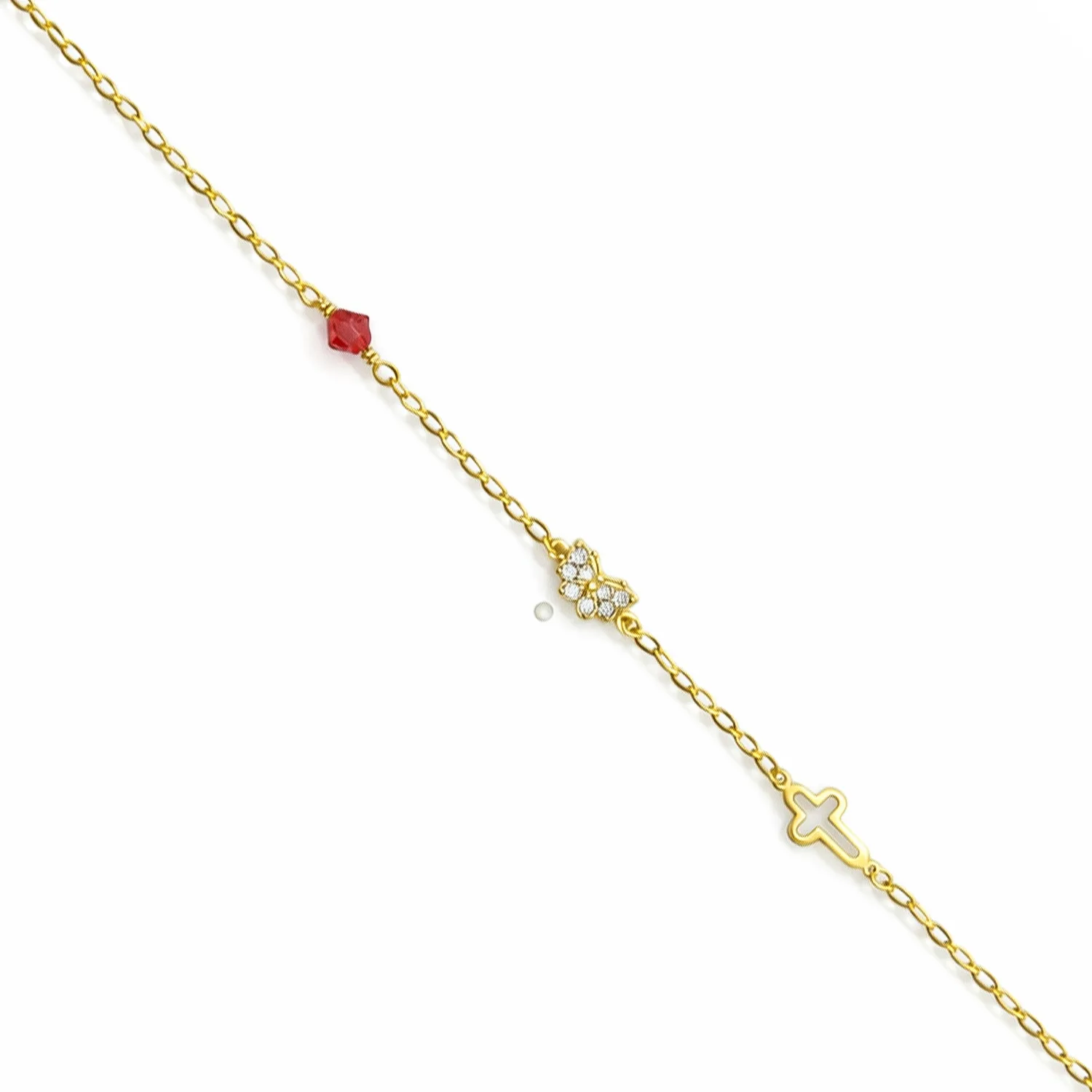 Ένα πανέμορφο χρυσό βραχιόλι που συνδυάζει την πίστη με τη χαρά. Διαθέτει έναν διακριτικό σταυρό, μια λαμπερή πεταλούδα στολισμένη με πέτρες ζιργκόν και μια κόκκινη πέτρα που δίνει χρώμα. Ένα υπέροχο κόσμημα για κάθε μέρα που θα φωτίσει τον καρπό σας.