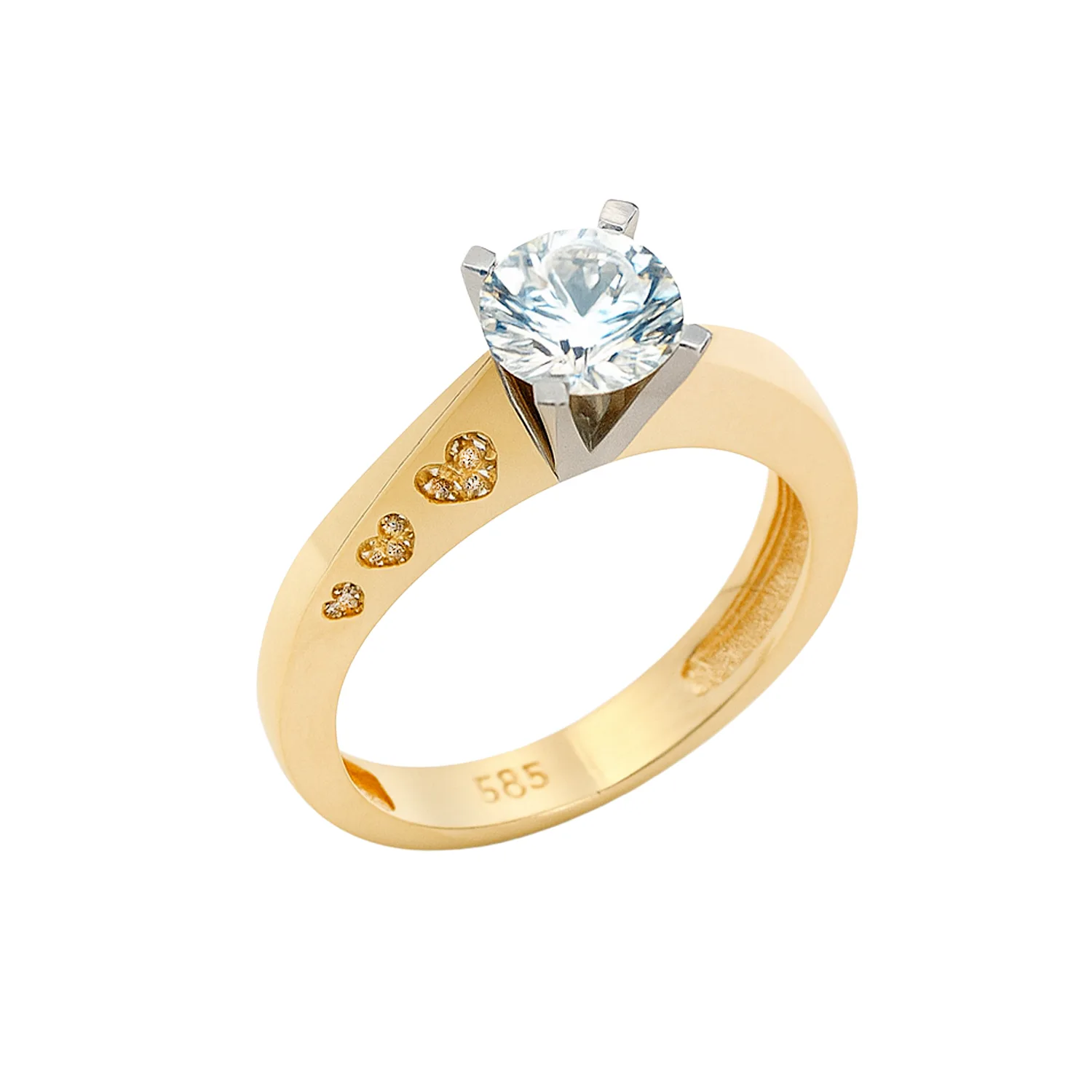 Ρομαντικό και εκλεπτυσμένο, αυτό το δαχτυλίδι από χρυσό 14 καρατίων συνδυάζει τη διαχρονική κομψότητα με λεπτομέρειες που εκφράζουν αγάπη. Η κεντρική πέτρα ζιργκόν σε κοπή brilliant στερεώνεται με τέσσερις βάσεις από λευκόχρυσο, ενώ στην πλαϊνή πλευρά της βέρας ξεχωρίζουν τρεις ανάγλυφες καρδιές διακοσμημένες με μικρά ζιργκόν.