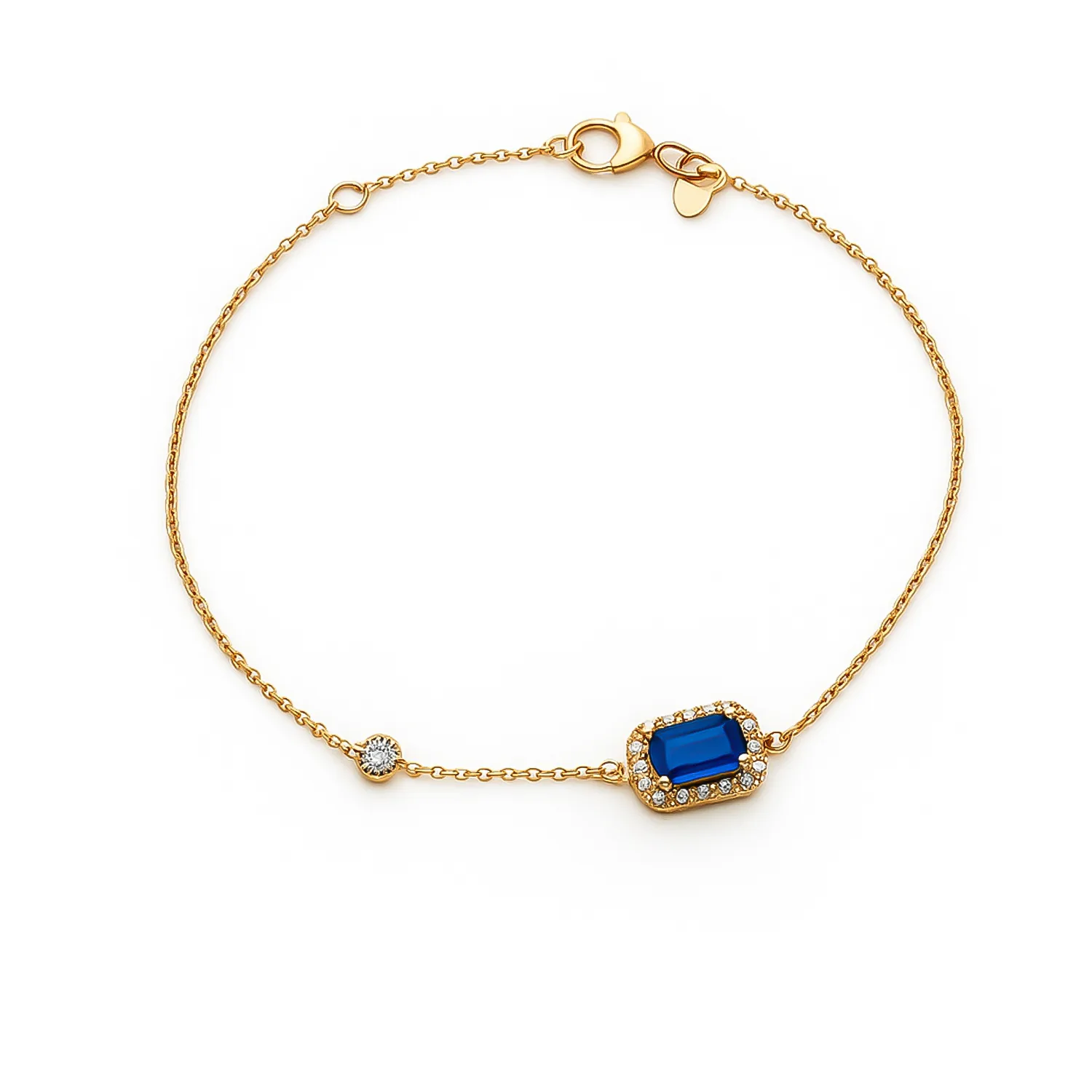 Ένα εκλεπτυσμένο και εντυπωσιακό βραχιόλι από χρυσό 14 καρατίων που μαγνητίζει τα βλέμματα. Η βαθιά μπλε πέτρα κοπής emerald στο κέντρο πλαισιώνεται από μια σειρά λαμπερά λευκά ζιρκόνια, ενώ η λεπτή αλυσίδα διακοσμείται με μία επιπλέον διακριτική λευκή πέτρα. Ένα κόσμημα που συνδυάζει κλασική φινέτσα και μοντέρνα λάμψη. Το απόλυτο στολίδι για τον καρπό σας, που συνδυάζει διαχρονική ομορφιά και διακριτική πολυτέλεια.