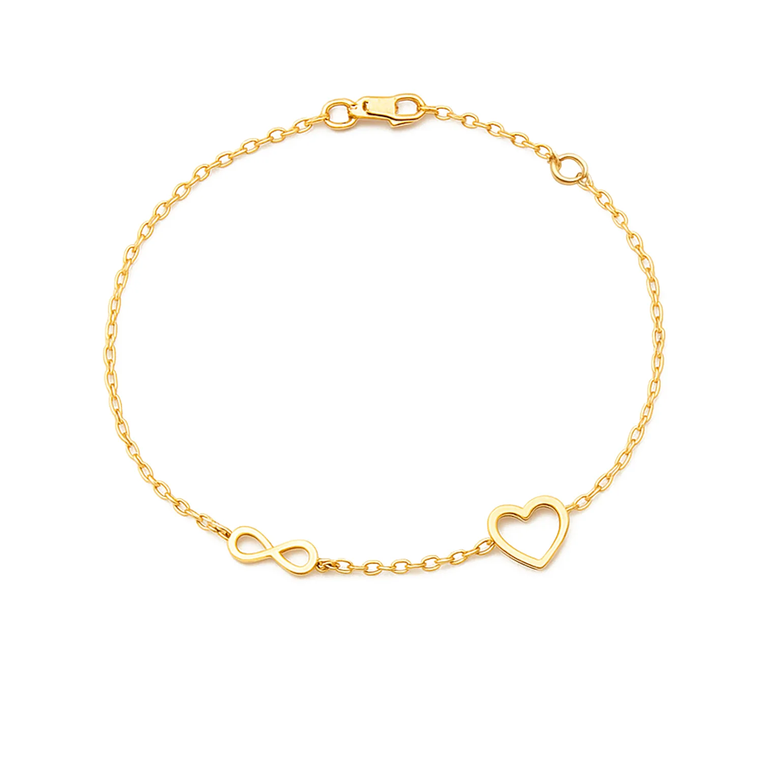 Ρομαντισμός και διαχρονικότητα συνδυάζονται σε αυτό το φίνο βραχιόλι από χρυσό 9 καρατίων. Με δύο κομψά μοτίβα – καρδιά και σύμβολο του απείρου – αποτελεί ένα μοναδικό κόσμημα που αποπνέει αγάπη, αιωνιότητα και φινέτσα. Η ελαφριά, διακριτική του σχεδίαση το καθιστά ιδανικό για καθημερινή χρήση ή ως τρυφερό δώρο σε αγαπημένα πρόσωπα.