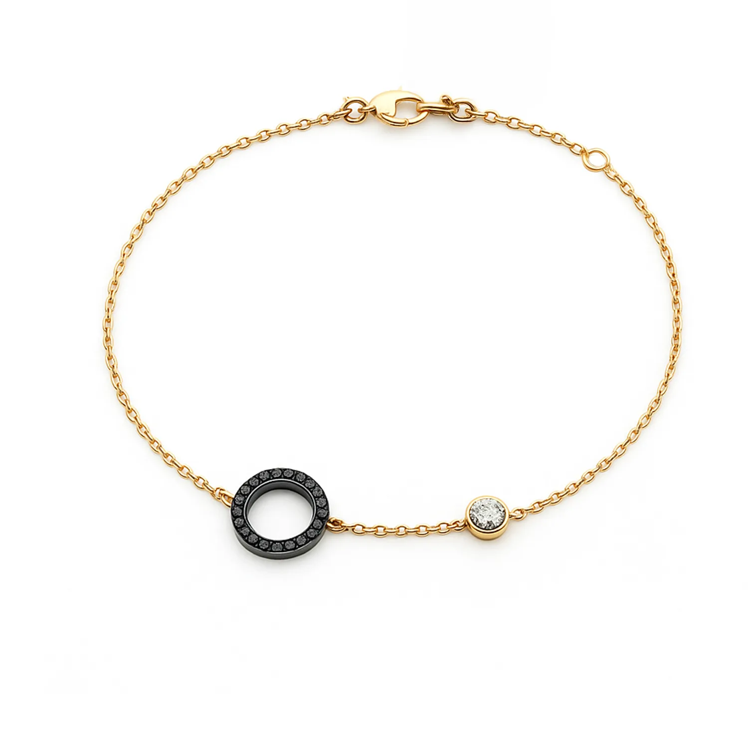 Μοντέρνο και κομψό, αυτό το βραχιόλι από χρυσό 14 καρατίων ξεχωρίζει για τη minimal αισθητική του. Το κεντρικό στοιχείο είναι ένας μαύρος κύκλος διακοσμημένος με μικρά μαύρα ζιργκόν, που πλαισιώνεται από ένα λαμπερό λευκό ζιργκόν σε καστόνι. Ιδανικό για όσες αγαπούν τη μοντέρνα κομψότητα και θέλουν να φορούν κάτι διαφορετικό, με διακριτική πολυτέλεια.