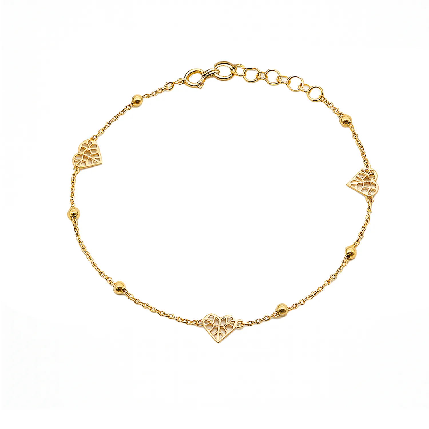 Αέρινο και παιχνιδιάρικο βραχιόλι από χρυσό 14 καρατίων με τρεις φινετσάτες πεταλούδες σε openwork σχέδιο και διακριτικές χρυσές μπίλιες κατά μήκος της αλυσίδας. Ένα σχέδιο που αποπνέει νεανικότητα, ελευθερία και θετική διάθεση, ιδανικό για όλες τις ώρες της ημέρας.