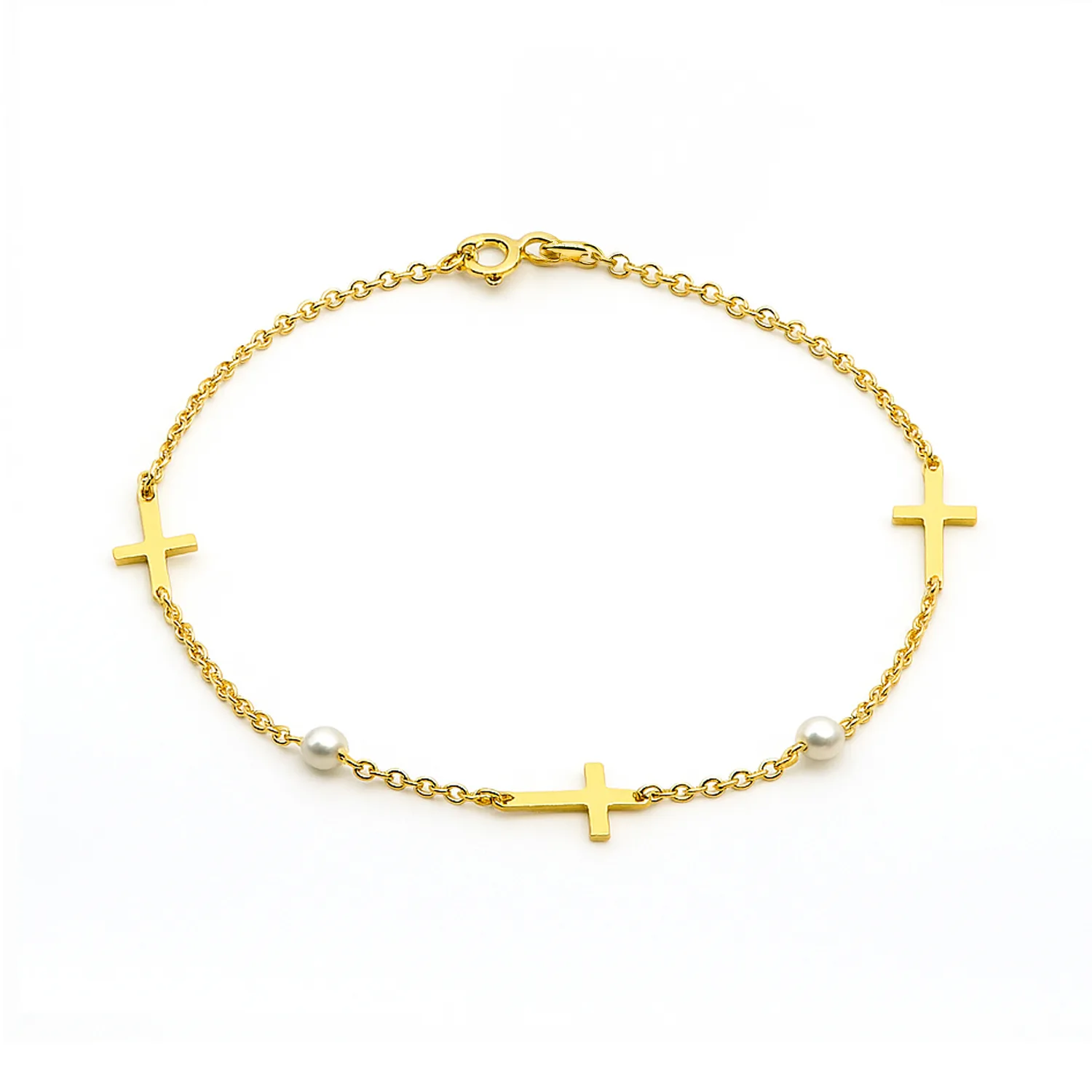 Κομψό και μοντέρνο βραχιόλι από χρυσό 14 καρατίων, διακοσμημένο με τρεις σταυρούς και δύο λευκά μαργαριτάρια. Η διακριτική αλυσίδα του αναδεικνύει τον μινιμαλιστικό σχεδιασμό, προσφέροντας μία διαχρονική πινελιά κομψότητας σε κάθε σας εμφάνιση. Ιδανικό για καθημερινή χρήση αλλά και για ιδιαίτερες περιστάσεις, είτε φορεμένο μόνο του είτε σε συνδυασμό με άλλα κοσμήματα. Ένα διαχρονικό κόσμημα με συμβολισμό και στυλ.
