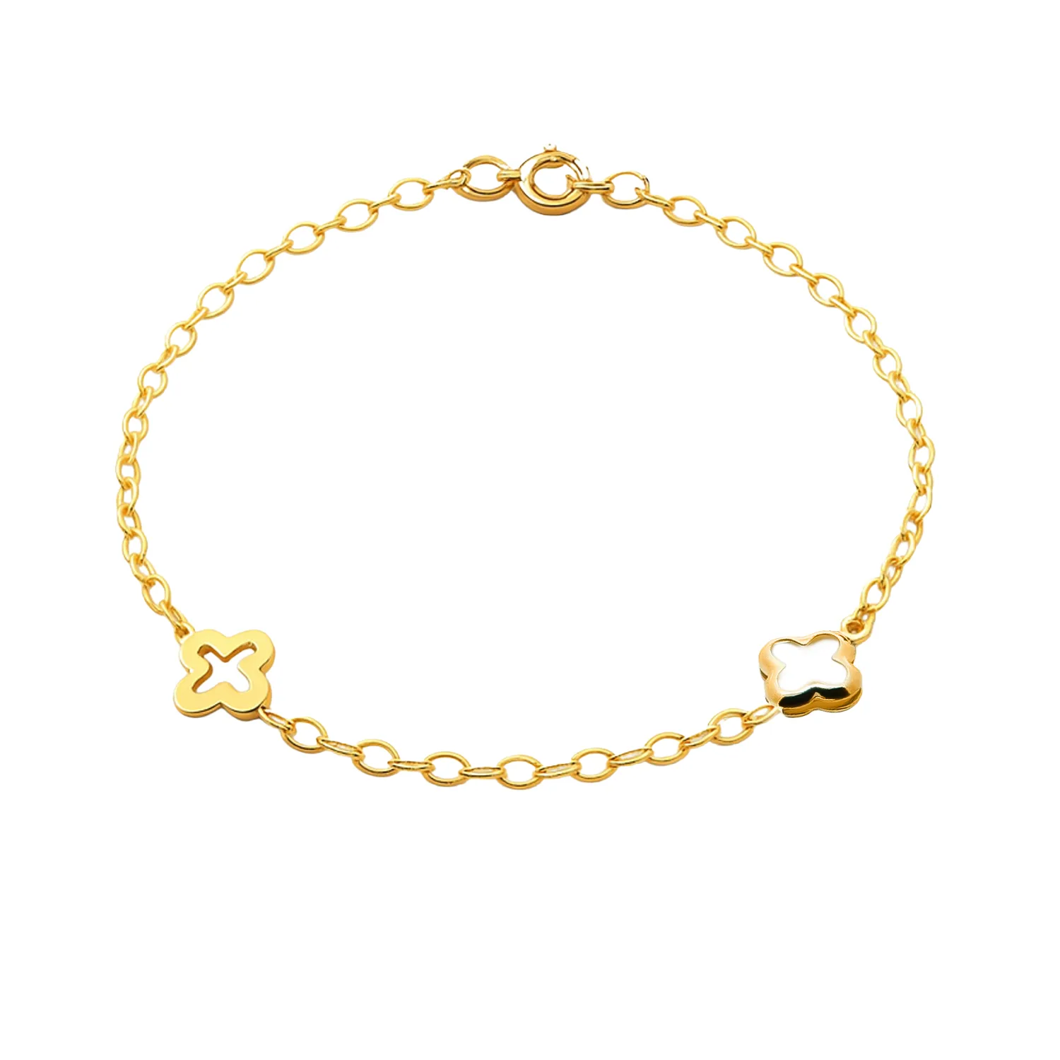 Μοντέρνο και φίνο, αυτό το βραχιόλι από χρυσό 9 καρατίων διαθέτει δύο κομψά διακοσμητικά τετράφυλλα μοτίβα – το ένα με λευκό σμάλτο και το άλλο με ανοιχτή σχεδίαση. Η λεπτή αλυσίδα αναδεικνύει τη διακριτική του αισθητική, καθιστώντας το ιδανική επιλογή για layering ή για minimal chic εμφανίσεις.