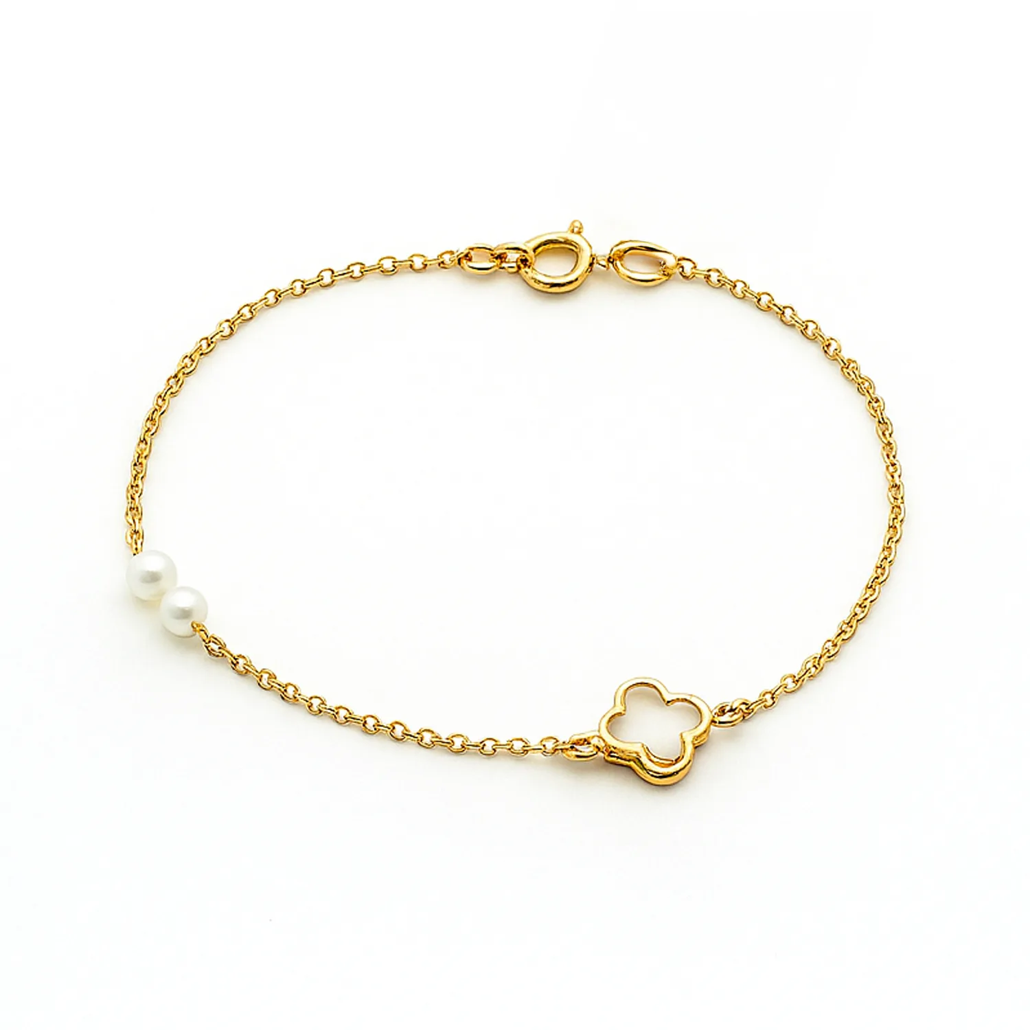 Κομψό και διακριτικό βραχιόλι από χρυσό 14 καρατίων, διακοσμημένο με ένα φίνο στοιχείο σε σχήμα τετράφυλλου με ένθετο λευκό φίλντισι και δύο φυσικά λευκά μαργαριτάρια. Η λεπτή του αλυσίδα και ο μίνιμαλ σχεδιασμός το καθιστούν ιδανικό για καθημερινή χρήση αλλά και για layering με άλλα κοσμήματα. Ένα διαχρονικό κόσμημα που συμβολίζει την τύχη και την κομψότητα.