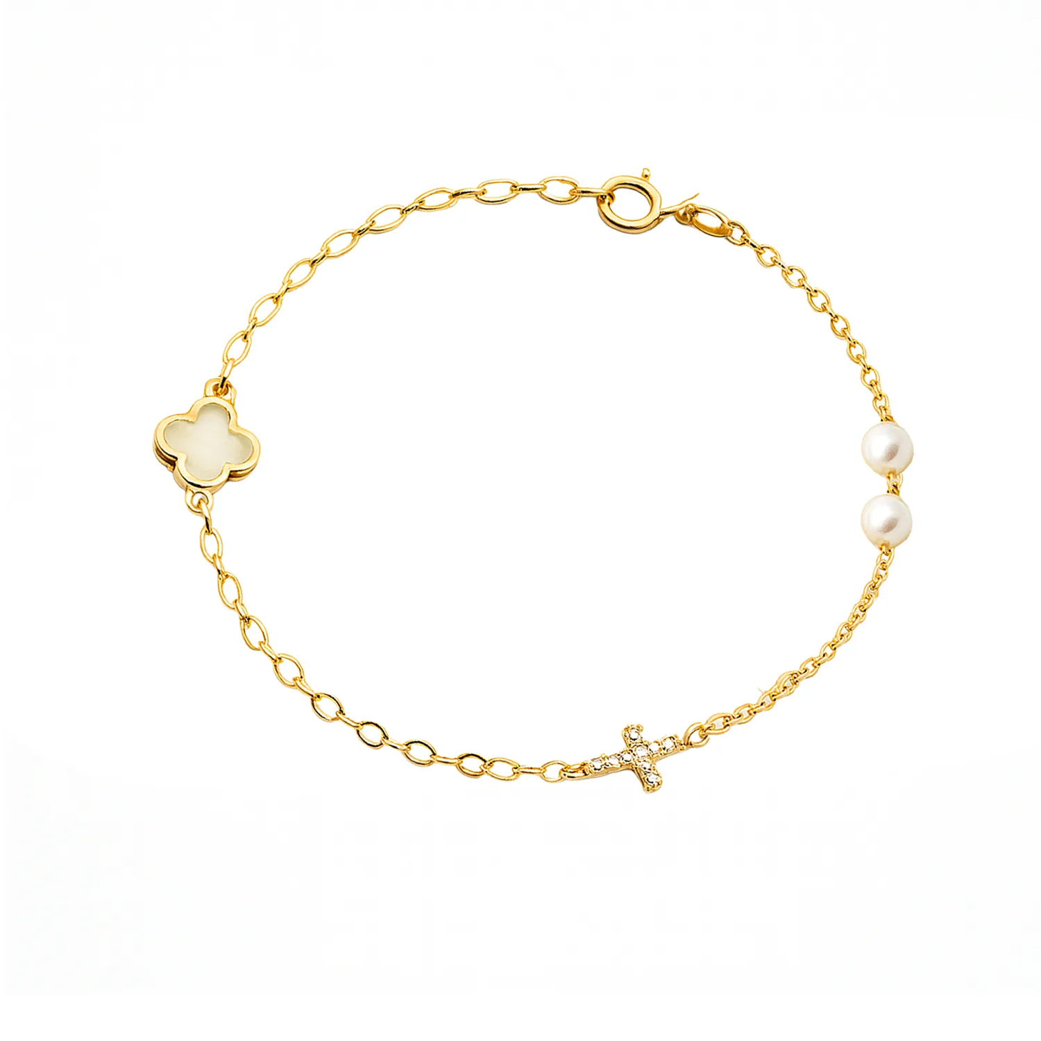 Λαμπερό βραχιόλι από χρυσό 9 καρατίων, διακοσμημένο με σταυρό με λευκά ζιργκόν, διακριτικό στοιχείο τριφυλλιού σε λευκή απόχρωση και δύο φυσικά μαργαριτάρια. Η εναλλαγή των στοιχείων προσδίδει μια αίσθηση κομψότητας και ρομαντισμού, καθιστώντας το ιδανική επιλογή για δώρο ή για να συμπληρώσει μία ιδιαίτερη εμφάνιση. Ισορροπεί ανάμεσα στην παράδοση και το σύγχρονο στυλ, προσφέροντας λάμψη με διακριτικότητα.