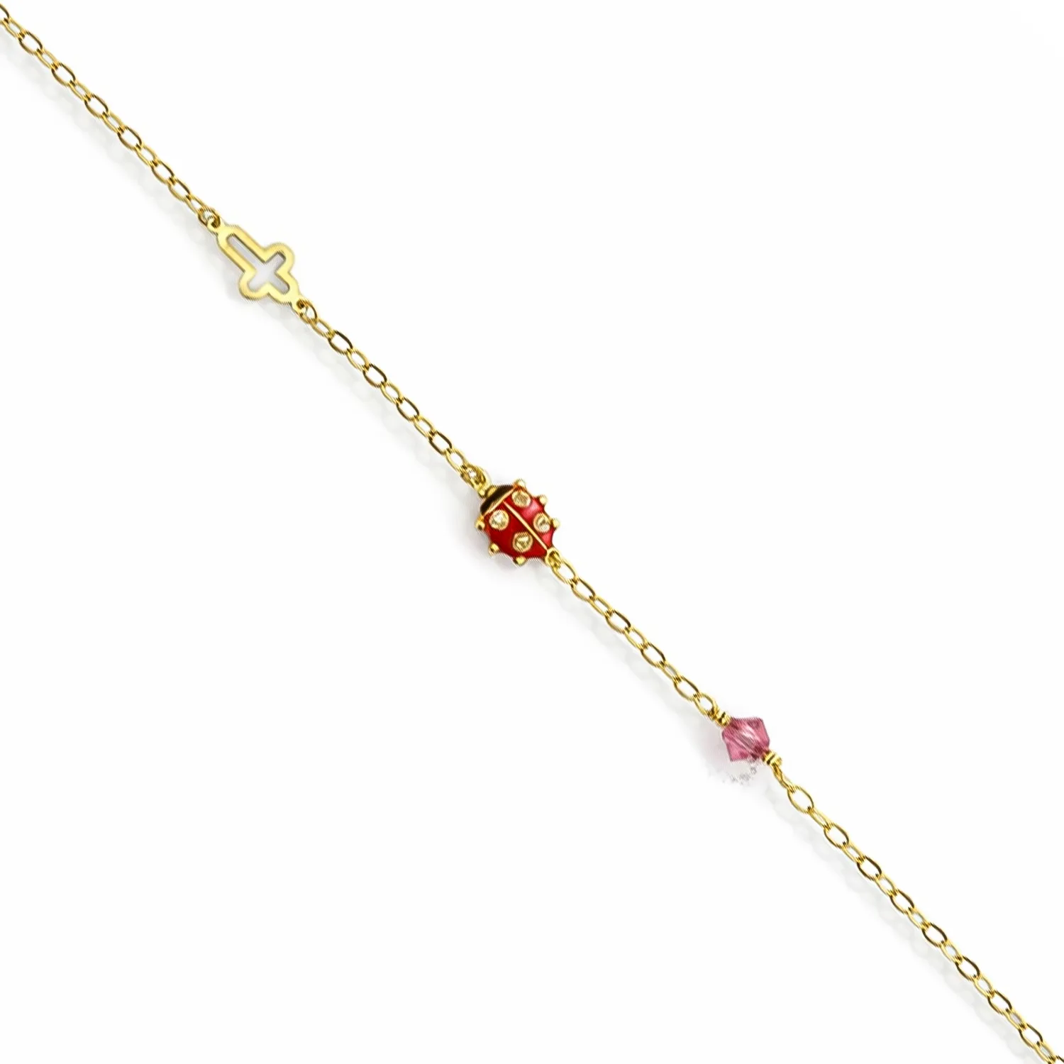 Ένα πανέμορφο χρυσό βραχιόλι που συνδυάζει τρία αγαπημένα σύμβολα: τον σταυρό για πίστη, την πασχαλίτσα για τύχη και μια μικρή ροζ πέτρα για λάμψη. Είναι ένα διακριτικό και χαρούμενο κόσμημα, ιδανικό για να φορεθεί κάθε μέρα και να φέρνει καλή διάθεση.